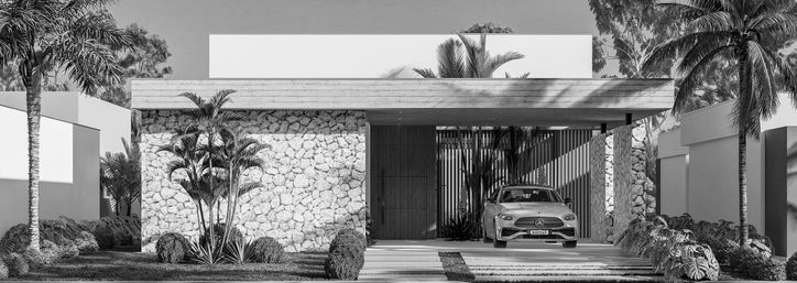 The Kinz House, with contemporary architecture and simple volume, which optimizes the use of natural light, shade and ventilation, brings modernist traits, expressed in straight lines and in the use of materials, such as exposed concrete and white masonry.